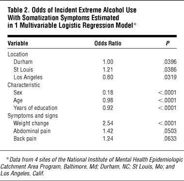 Table 2. Odds of Incident Extreme Alcohol Use With Somatization Symptoms Estimated in 1 Multivariable Logistic Regression Model*