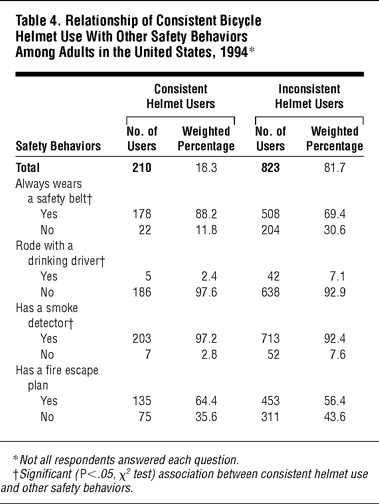 Table 4. Relationship of Consistent Bicycle Helmet Use With Other Safety Behaviors Among Adults in the United States, 1994*