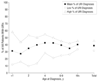 A computerized record is initiated for each patient when he or she enters the clinic, and this record is used for follow-up visits. For each visit a diagnosis must be made and recorded on the record. The diagnosis is then entered into the computerized record. This information is then used to code the visit for billing purposes using International Classification of Diseases, Ninth Revision6 codes. New physicians are instructed on what has to be written on the record so that an International Classification of Diseases code can be assigned. The diagnoses used in this study were obtained by searching all diagnoses for all patients seen during the study period and selecting those of OMwith or without effusion, sinusitis, pharyngitis, tonsillitis, bronchitis, and URI unspecified. The former group was called OM and the latter group URI for this study. For the small number of patients where OM and URI were present together, the case was assigned to the OM category.
