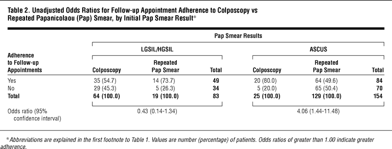 Table 2. Unadjusted Odds Ratios for Follow-up Appointment Adherence to Colposcopy vs Repeated Papanicolaou (Pap) Smear, by Initial Pap Smear Result*