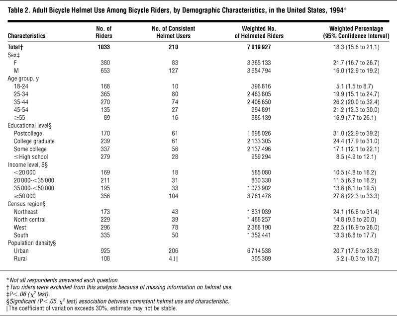 Table 2. Adult Bicycle Helmet Use Among Bicycle Riders, by Demographic Characteristics, in the United States, 1994*