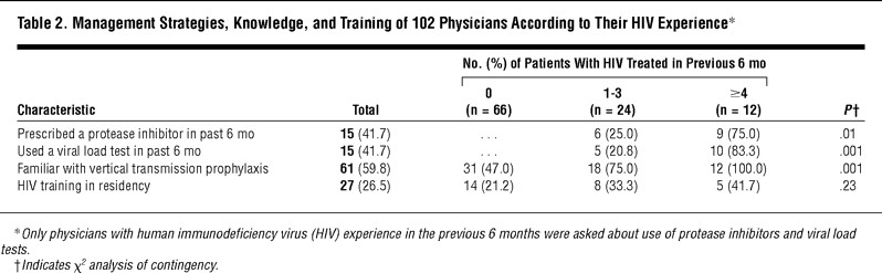 Table 2. Management Strategies, Knowledge, and Training of 102 Physicians According to Their HIV Experience*