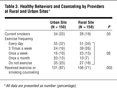 Table 3. Healthy Behaviors and Counseling by Providers at Rural and Urban Sites*