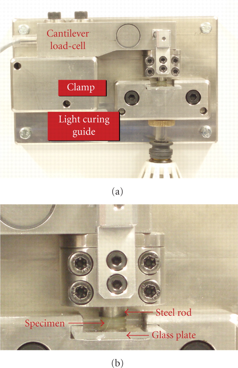 (a) The Bioman stress measurement device. (b) A close view of the resin-composite specimen. Equipment is from the Biomaterials Research Group, School of Dentistry, University of Manchester (Manchester, UK).