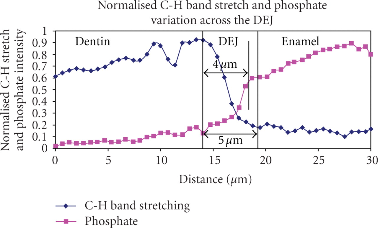 Typical normalized micro-Raman C–H stretch (2900 cm−1) and phosphate band (960 cm−1) peak intensity variations along a line oriented to cross the DEJ at a perpendicular angle. In this sample, DEJ width was estimated at 4 μm based on the peak phosphate band stretch intensity variation. Peak C–H stretching estimated DEJ width at 5 μm.