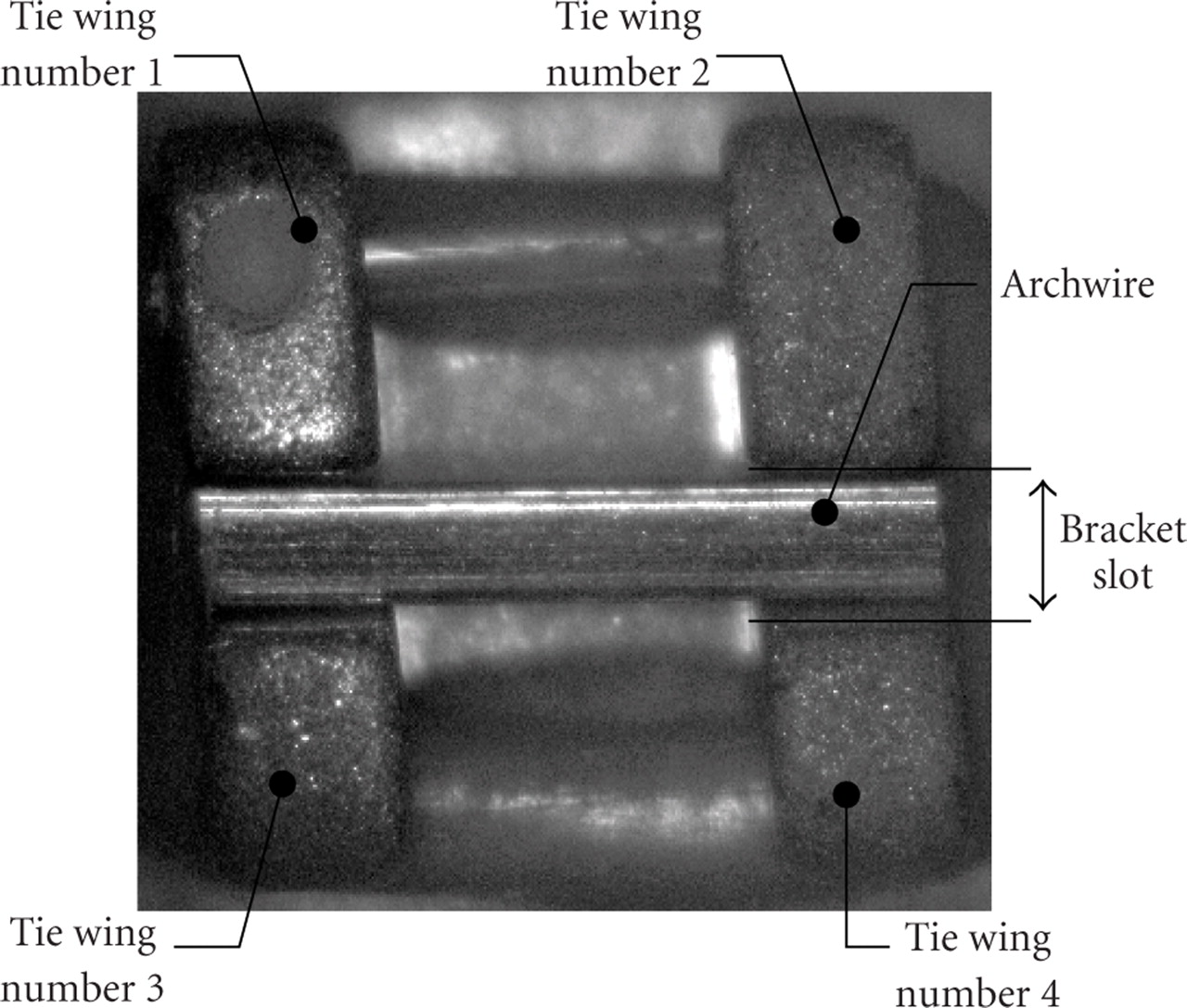 A typical image collect from the image system showing the scale and components of the bracket/archwire system.
