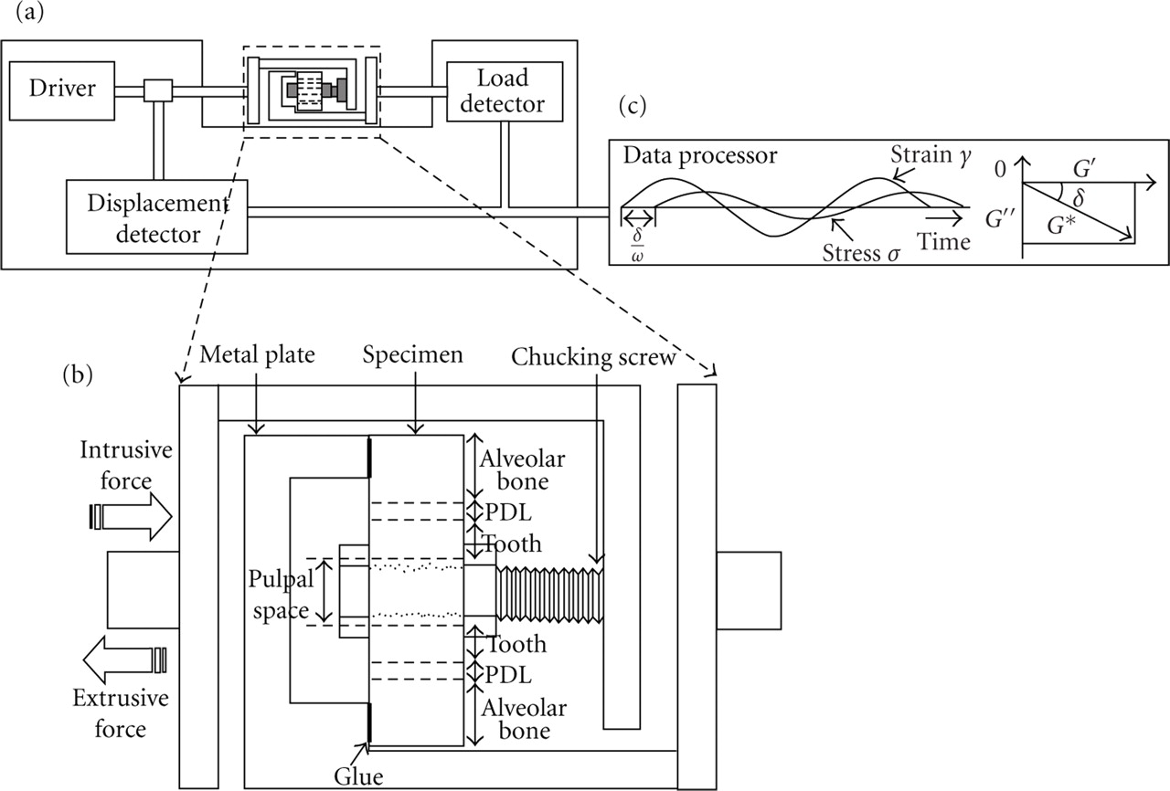 (a) Diagram of the dynamic viscoelastometer. (b) Chucking device with a transverse section of a tooth root. (c) A schematic record of dynamic stress and strain during a sinusoidal oscillating strain, reproduced from Tanaka et al. [79], by permission.