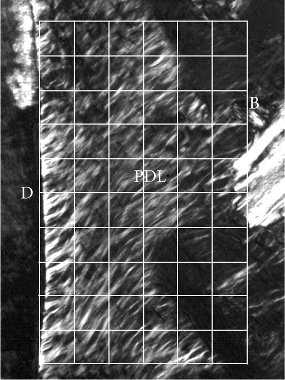 Polarised light micrograph of the periodontal ligament (PDL) on the buccal side in an unstained bucco-lingal section of a mechanical specimen. Image analysis was done for each grid (30 × 30 μm), adapted from Kawada and Komatsu [34].