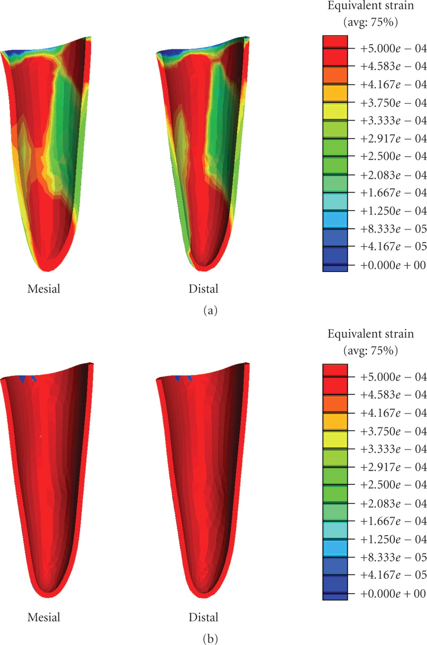 Equivalent strain contours in the premolar PDL (a) prebridgework models and (b) FPD models.
