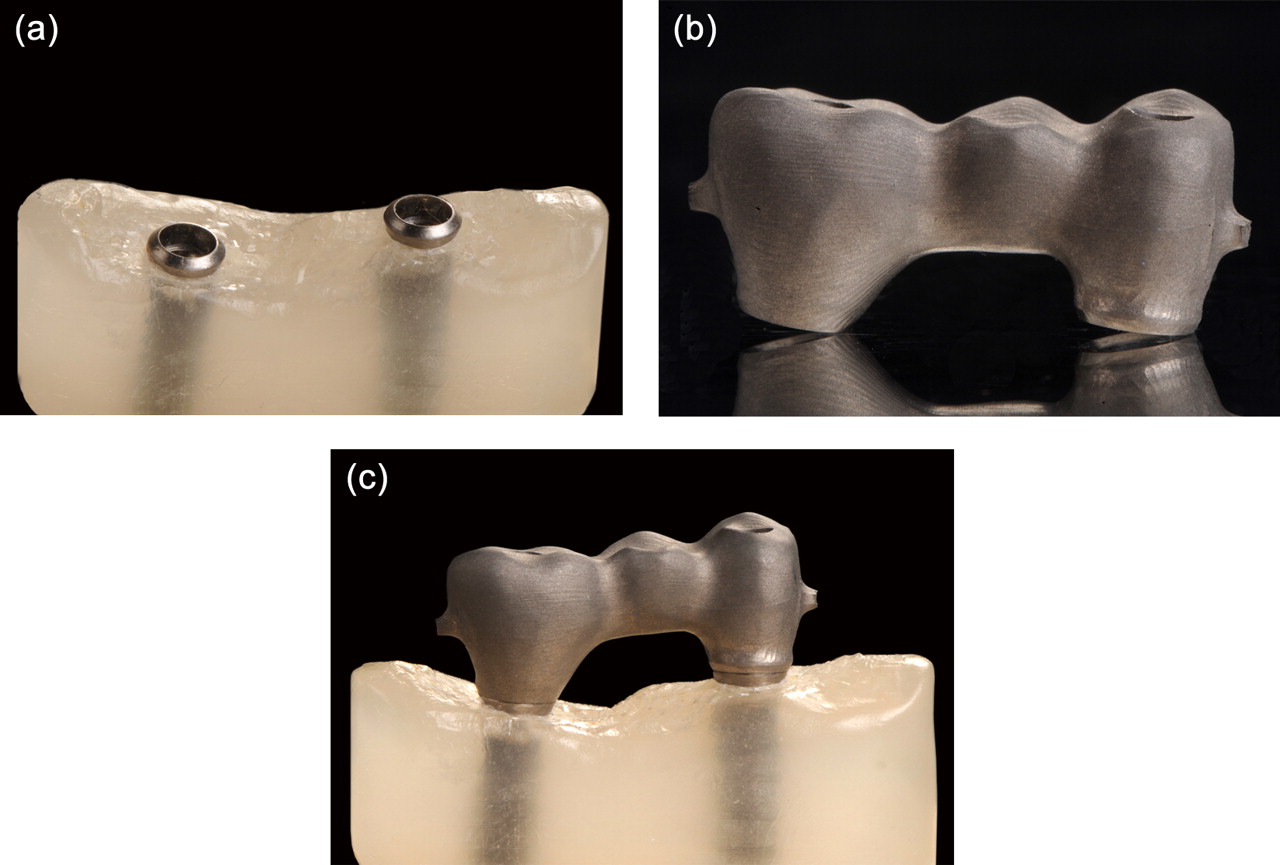 (a) Photograph of master cast containing the two implants, (b) implant framework and (c) screw-retained framework on master cast in actual position.