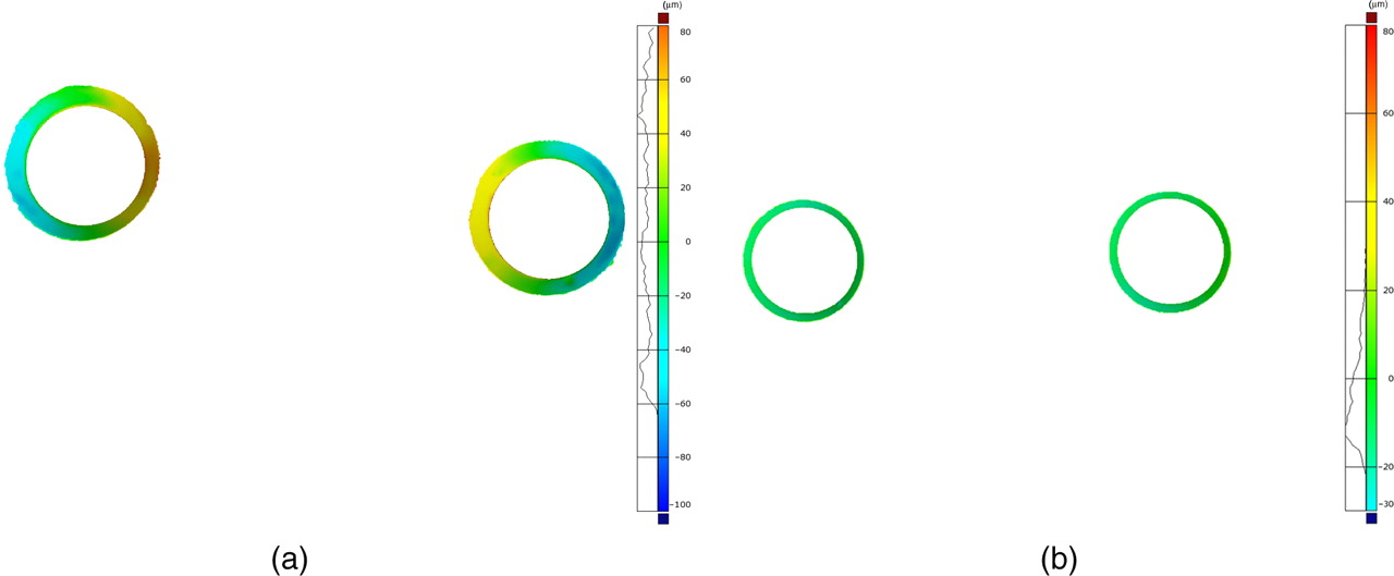 Exemplary screenshot of ROIs. (a) The deformation of the cast superstructure with an increased gap size towards the pontic area is clearly visible. (b) The CAD-/CAM-manufactured superstructure reveals equal circumferential fit.