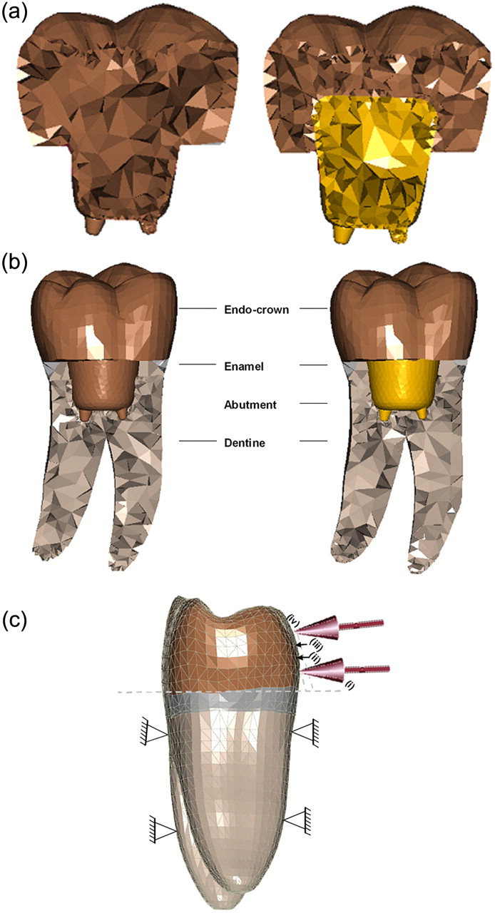 (a) Longitudinal cross section of the two endo-crown models. Monobloc (on the left) and endo-crown with primary abutment (on the right). (b) Longitudinal cross section of the numerical models describing their components. Monobloc (on the left) and endo-crown with primary abutment (on the right). (c) Configuration and boundary conditions of the numerical models with a force of 1400 N: (i) loading point is 5 mm from the restoration–tooth junction; (ii) loading point is 6 mm from the restoration–tooth junction; (iii) loading point is 7 mm from the restoration–tooth junction and (iv) loading point is 8 mm from the restoration–tooth junction.
