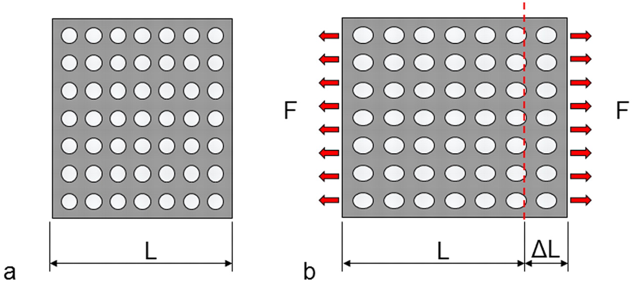 (a) A piece of a material that is unloaded and (b) a distributed tensile force (F) elongates the piece of material.