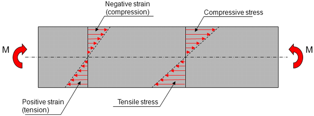 A beam, with a symmetric cross section, subjected to pure bending. The bending moment (M) induces tensile stresses and strains in the lower half of the beam and compressive stresses and strains in the upper half.