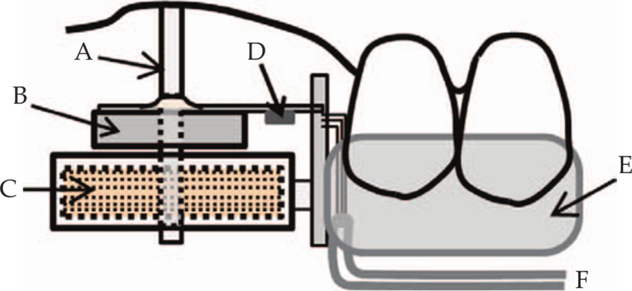 A: loading rod; B: permanent magnet; C: electromagnet; D: strain gauge; E: occlusal appliance; F: cords to amplifier.