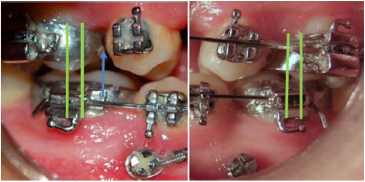 Super class I molar relationships at both sides after applying 1-mm preactivation bends. Sometimes, space creates mesial to first molars (blue arrow).