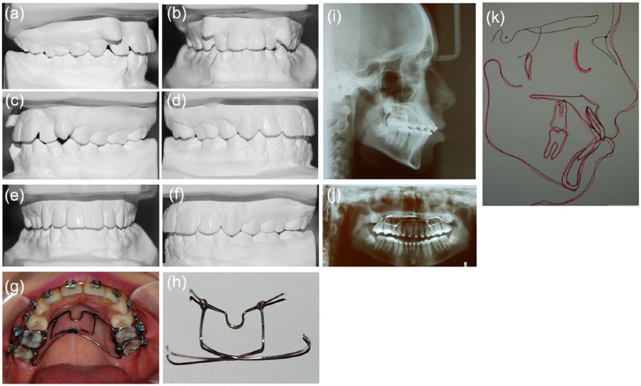 Patient M.A. 16 years old, with a class I severe crowding problem: (a–f) study models before and after treatment; (g, h) butterfly arch when it is in place and when it is removed, respectively; (i, j) lateral cephalogram when the butterfly arch is in place; and (k) cranial base superimposition shows excellent control of anteroposterior and vertical dimensions during treatment although a little vertical growth is evident.