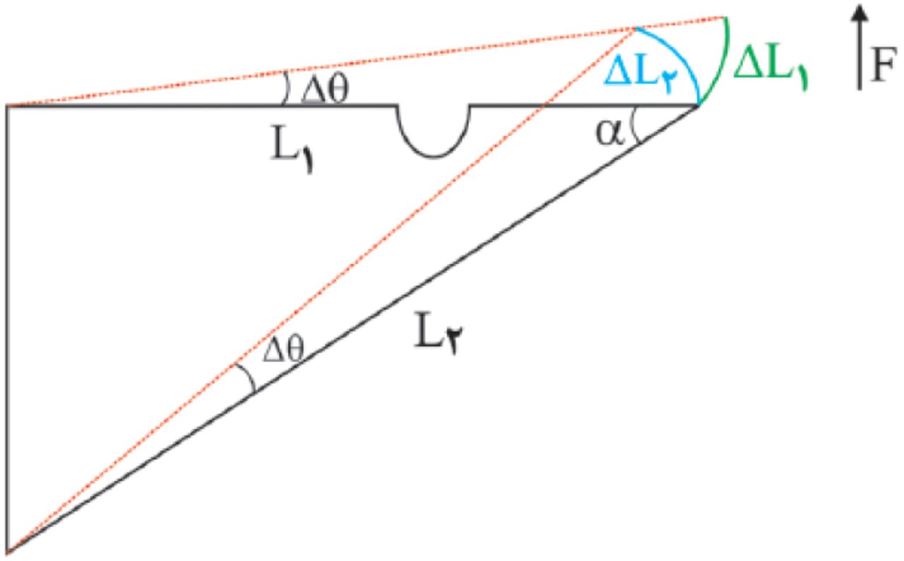 Schematic and exaggerated illustration of the role of tension in a bracing element. F: mesially directed force, L1: length of the bar, L2: length of bracing system, Δθ: angular change which is very small, ΔL1: linear change at the present of bracing element, ΔL2: linear change when bracing element is not active and whole system is under rotation to H point, and H − H′: differential length change in L2 when tension created.