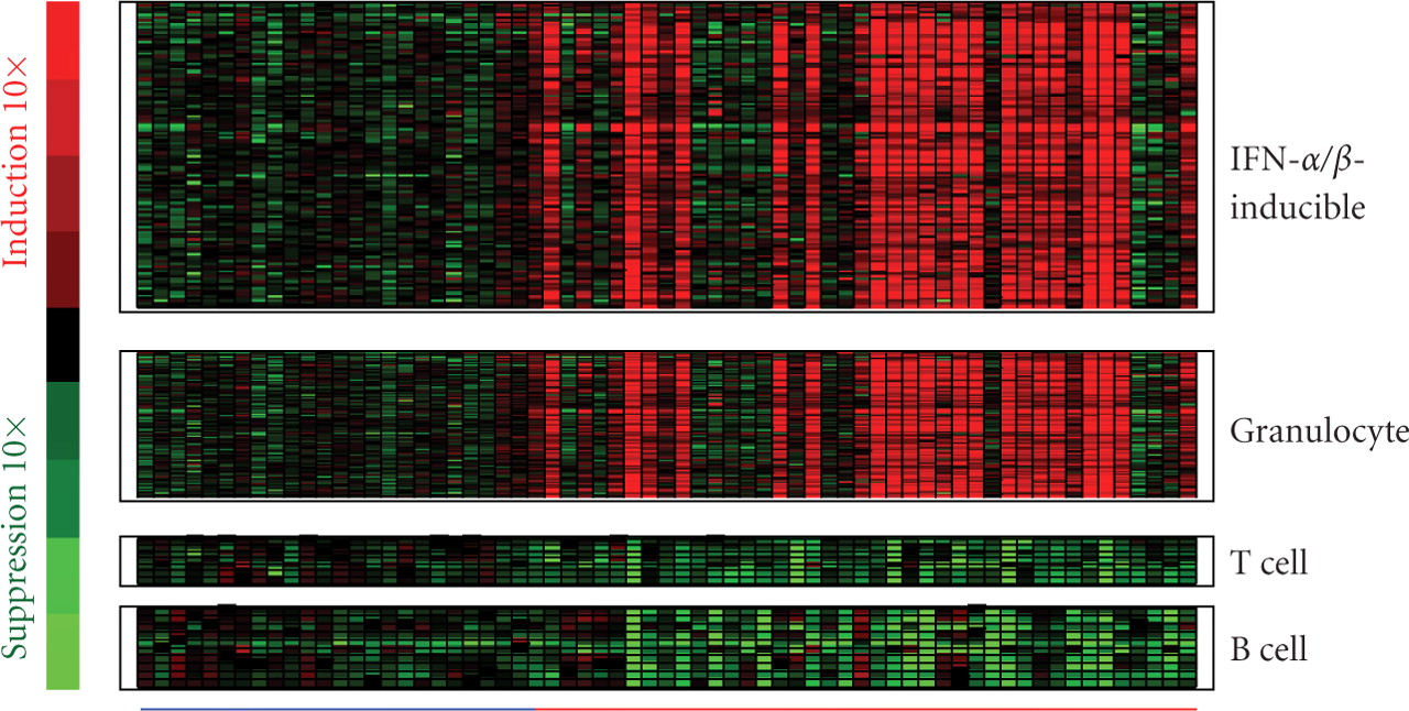 Representative heat map visualizing the overexpression of IFN-α/β-inducible gene signature, granulocyte signature, and underexpression of T-cell and B-cell signature in WB from 41 SLE patients Graphic compared with WB from 24 healthy donors Graphic. IFN = interferon; SLE = systemic lupus erythematosus.