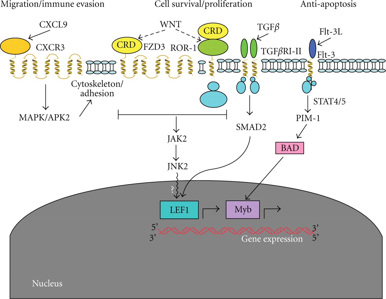 Schematic representation of four novel signaling pathways that may contribute to the malignant phenotype observed in early stage CLL.