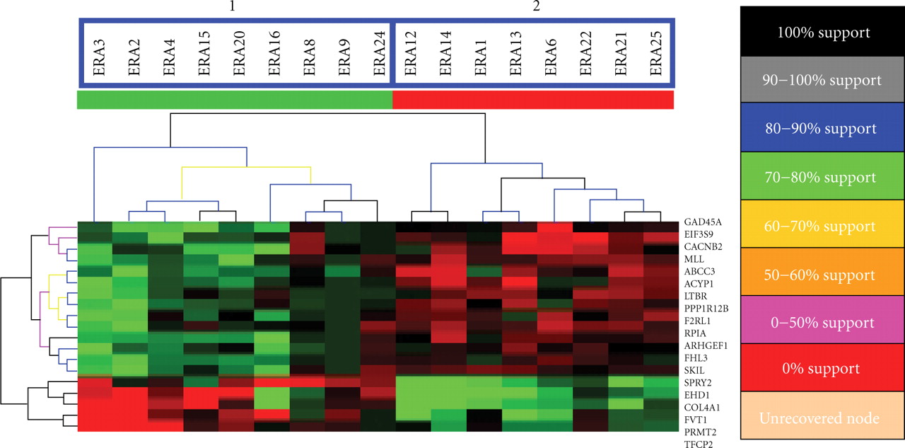 Support tree hierarchical clustering was applied to the expression profiles of 19-predictor genes among the 17 patients. A. Jackknife resampling was used with permutation 500 times. The color codes correspond to a given level of support. Branchs 1 and 2 are significantly separated according to their disease severity (P = .00004, Fisher's Exact Test).