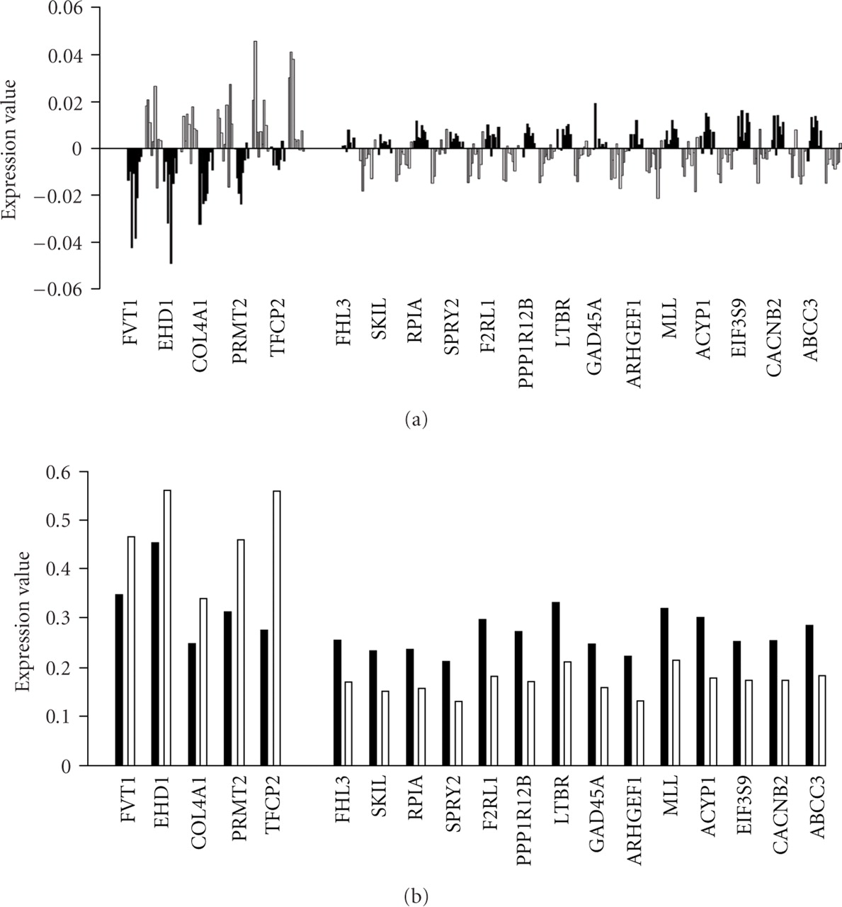 Identity and expression levels of the 19 genes in individuals comprising the future mild and future severe disease groups are shown by bar graphs. (a) The normalized polished expression data of these 19 genes in severe and mild groups. (b) The original expression data without normalization in the future severe and mild groups for the 19-predictor genes. Note that standard deviations are not shown because the t statistic was calculated based on permutations. Black bars represent the severe group, white bars represent the mild group.