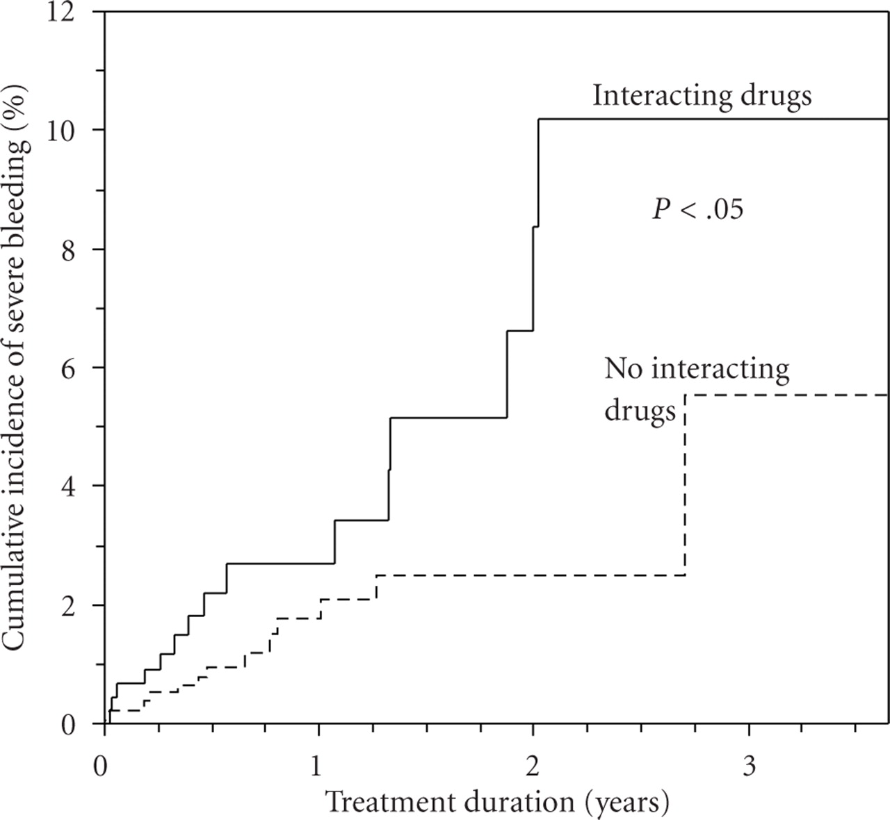 Cumulative incidence or severe bleeding in warfarin-treated users and non-users of drugs potentially interacting with warfarin. Data from the WARG cohort [5].