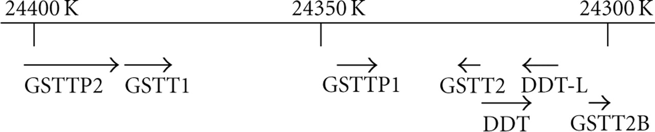 Organization of the human GST Theta gene region. The figure is drawn approximately to scale, based on NCBI Reference Sequence: NC_000022.10, Homo sapiens chromosome 22, GRCh37 primary reference assembly.