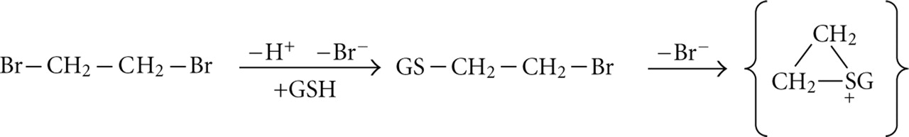 Activation of ethylene dibromide to an electrophile by glutathione conjugation.