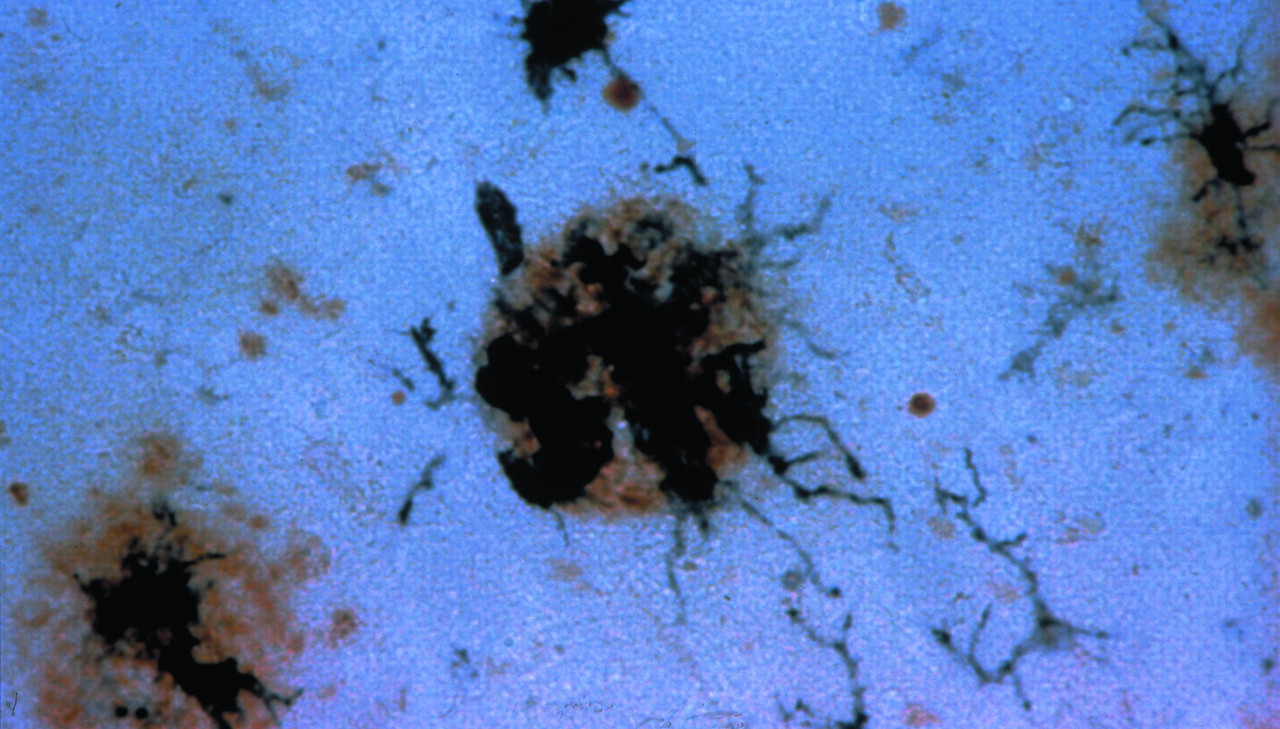 Immunohistochemical staining of activated microglia clustered around a senile plaque. Senile plaques are stained brown with the use of an antibody specific for the ß-amyloid protein. Antibody specific for a membrane protein expressed by activated microglia develop a dark purple color in the staining reaction.