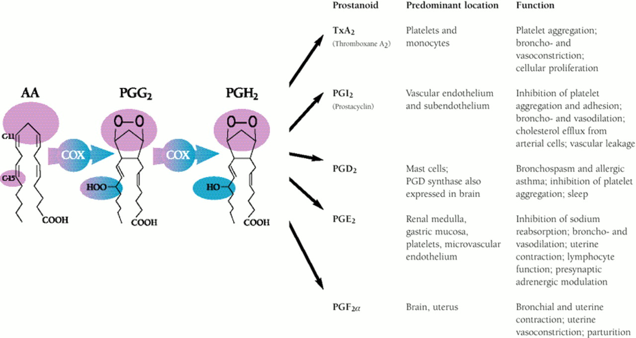 Prostanoid activities derived from COX activity. Prostaglandin G/H synthase (COX) is bifunctional: its bis-cyclooxygenase activity, directed both at C-11 and C-15 of arachidonic acid (AA), is indicated in purple; its hydroperoxidase activity, directed to the peroxide adduct at C-15 of prostaglandin G2 (PGG2), is indicated in blue.