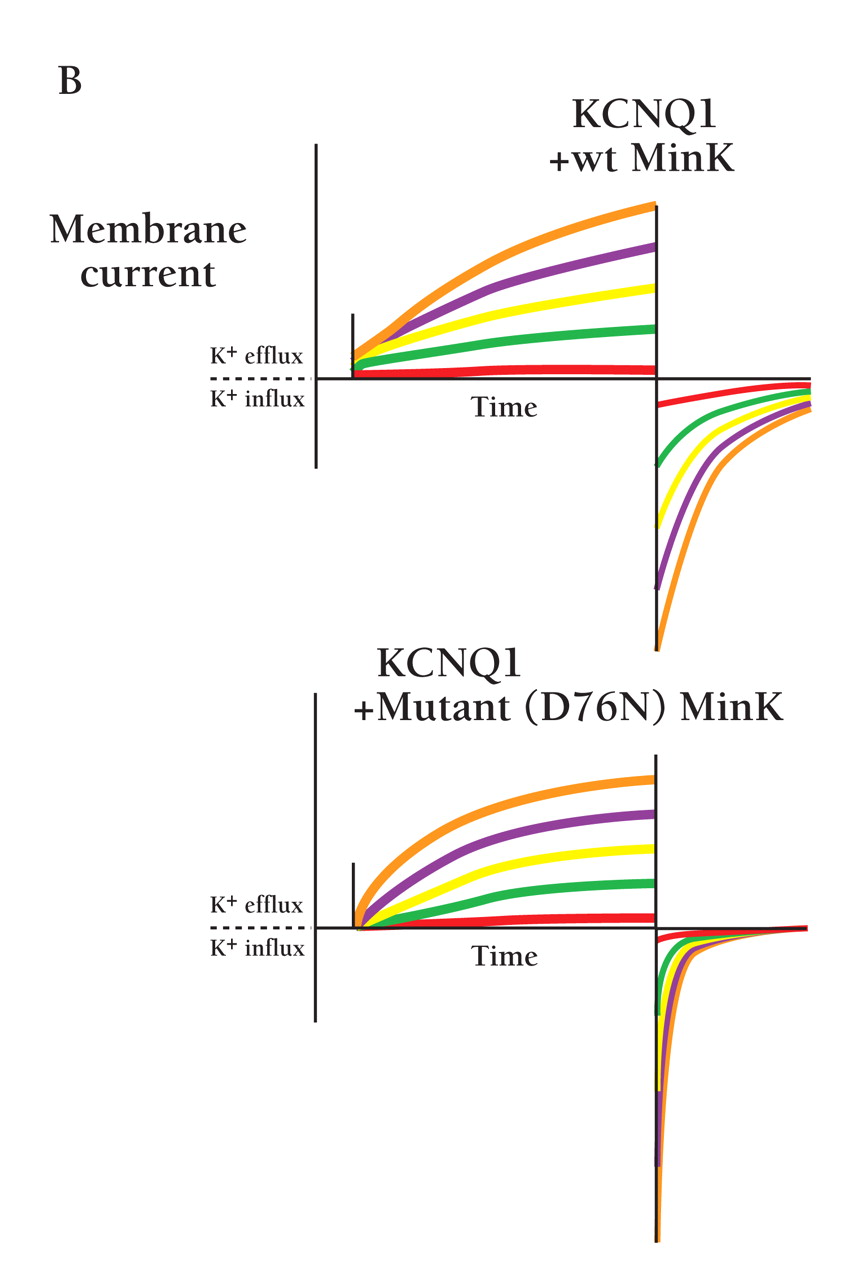 B. Characterization of IKs current arising from mutant MinK. Currents were studied in Xenopus laevis oocytes and measured in excised inside-out patches in symmetrical 100 mM KCl. The KCNQ1 protein was co-expressed either with wild-type MinK or mutant form of MinK that is associated with Jervell and Lange-Nielsen syndrome. Patches were held at -60 mV and depolarized for 6 s to voltages of 0 (red), 20 (green), 40 (yellow), 60 (purple), and 80 (orange) mV. (NB: The reduction in single channel conductance associated with the mutant MinK is not indicated; see text for details.)