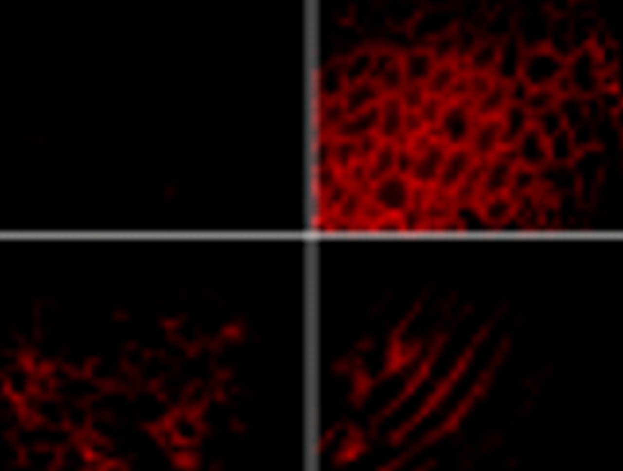 Immunohistochemical staining of dystrophin in the diaphragm muscle. Tissues are shown from (A) an untreated mdx mouse, (B) a C57 normal mouse, (C) an mdx mouse three days after gene transfer, and (D) an mdx mouse seven days after gene transfer (magnification 400x).