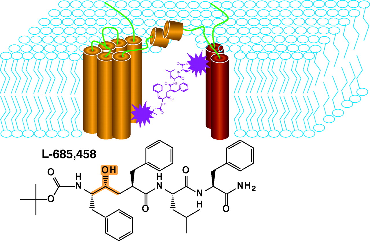 Photoreactive groups (shown as pruple star-like geometries) incorportated into L-685,458 result in covalent labeling of PS1, schematized as yellow (N-terminal–derived fragment) and red (C-terminal–derived fragment) subunits. Depending on placement of the photoreactive function, either of the two PS1 subunits can be covalently modified by the inhibitor. The hydroxyethylene isostere of L-685,458 is highlighted (see Figure 5).