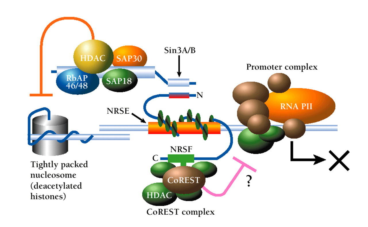 Dual mechanism of repression via the NRSF–NRSE interaction. The N-terminal domain of NRSE-bound NRSF interacts with Sin3, which in turn recruits histone deacetylase (HDAC) and associated proteins (SAP30, SAP18, RbAp46/48) to the promoter region. HDAC deacetylates lysine residues of nucleosomal core histones, which consequently limits the accessibility of DNA to transcription factors; the resulting inhibition of RNA polymerase activity (RNA PII) is indicated schematically by an X. In addition, a zinc-finger domain proximal to the C terminus of NRSF interacts with CoREST. CoREST recruits an HDAC complex that includes HDAC1 and HDAC2 and mediates repression that is distinguished by resistance to trichostatin A. Multiple corepressor mechanisms are thus indicated; see text for details.