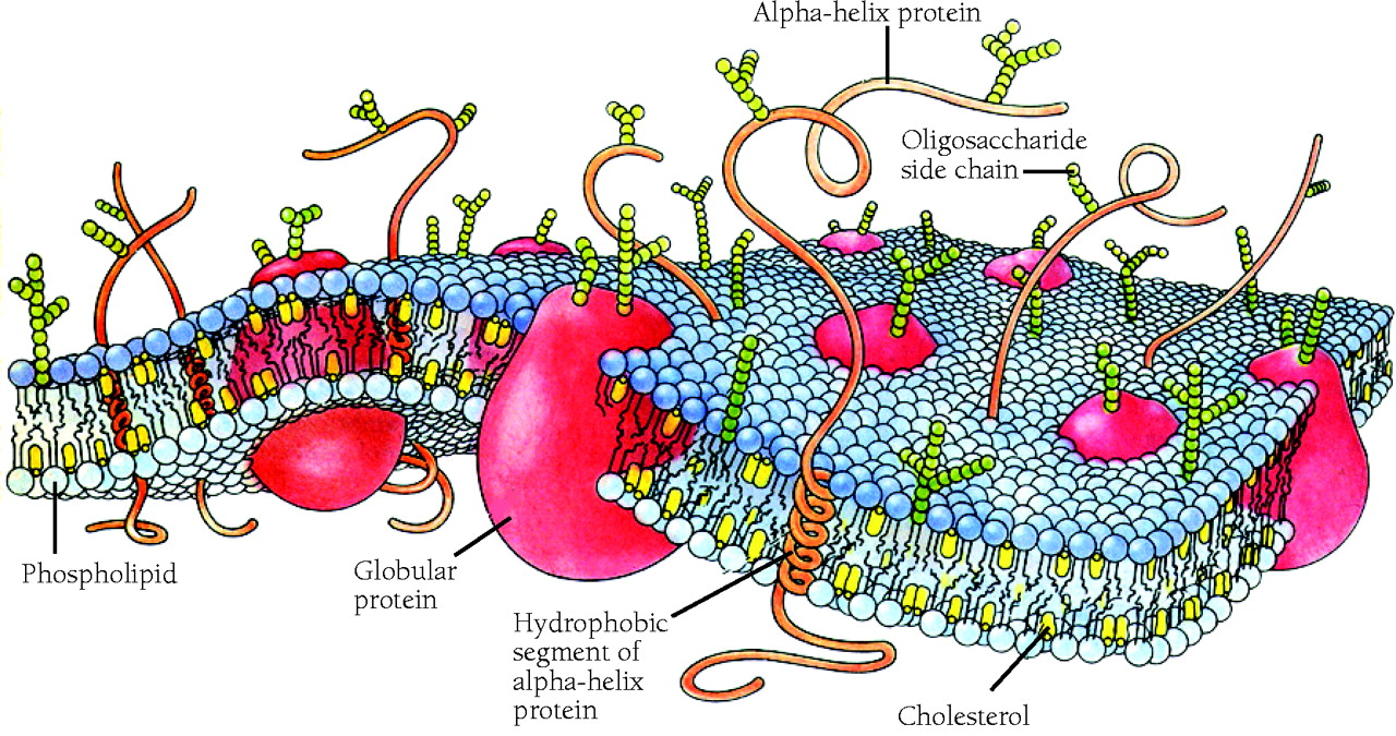 Schematization of the plasma membrane, showing phospholipids, cholesterol, sugars, and various proteins. Note the complexity apparent even in this extremely simplified rendering. [Reproduced with permission from Scientific American 253, 100-108 (1985).]