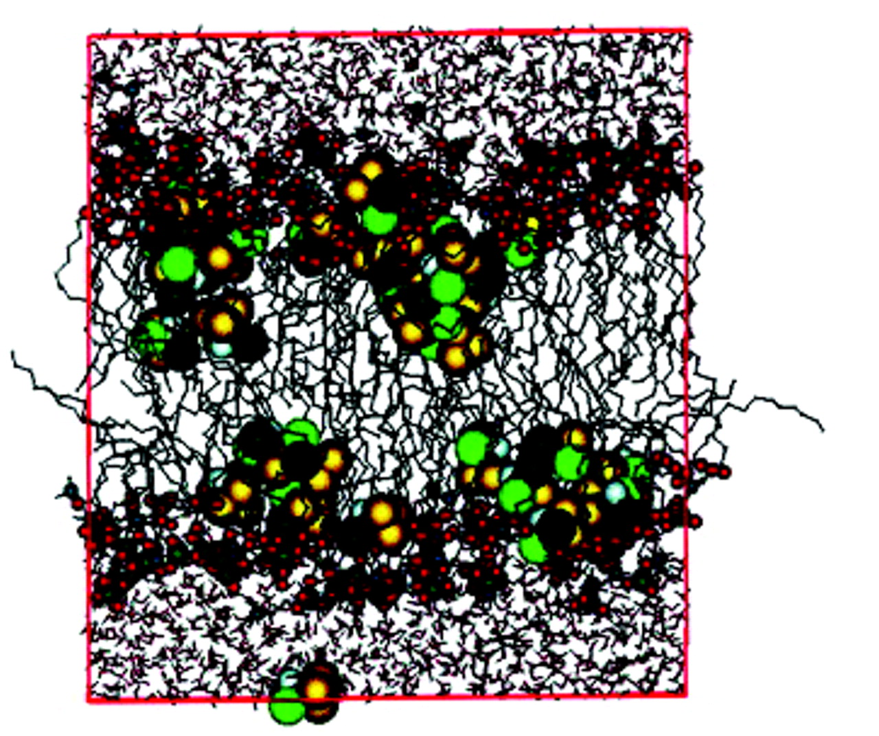 A proposed anesthetic mechanism that includes contributions from both the lipid bilayer and membrane proteins. Halothane (consisting of the larger, colored spheres), a typical inhaled anesthetic haloalkane, localizes preferentially to the amphiphilic regions (shown as small, colored spheres) of the bilayer (in which the acyl side chains are shown as ball-and-stick strands) in this molecular dynamics simulation; the aqueous milieu is represented at the upper and lower peripheries of the red box. [Reproduced with permission; Koubi, L. et.al., Biophysical Journal 78, 800–811 (2000).] This non-uniform distribution makes it likely that the lateral pressure profile will be altered.