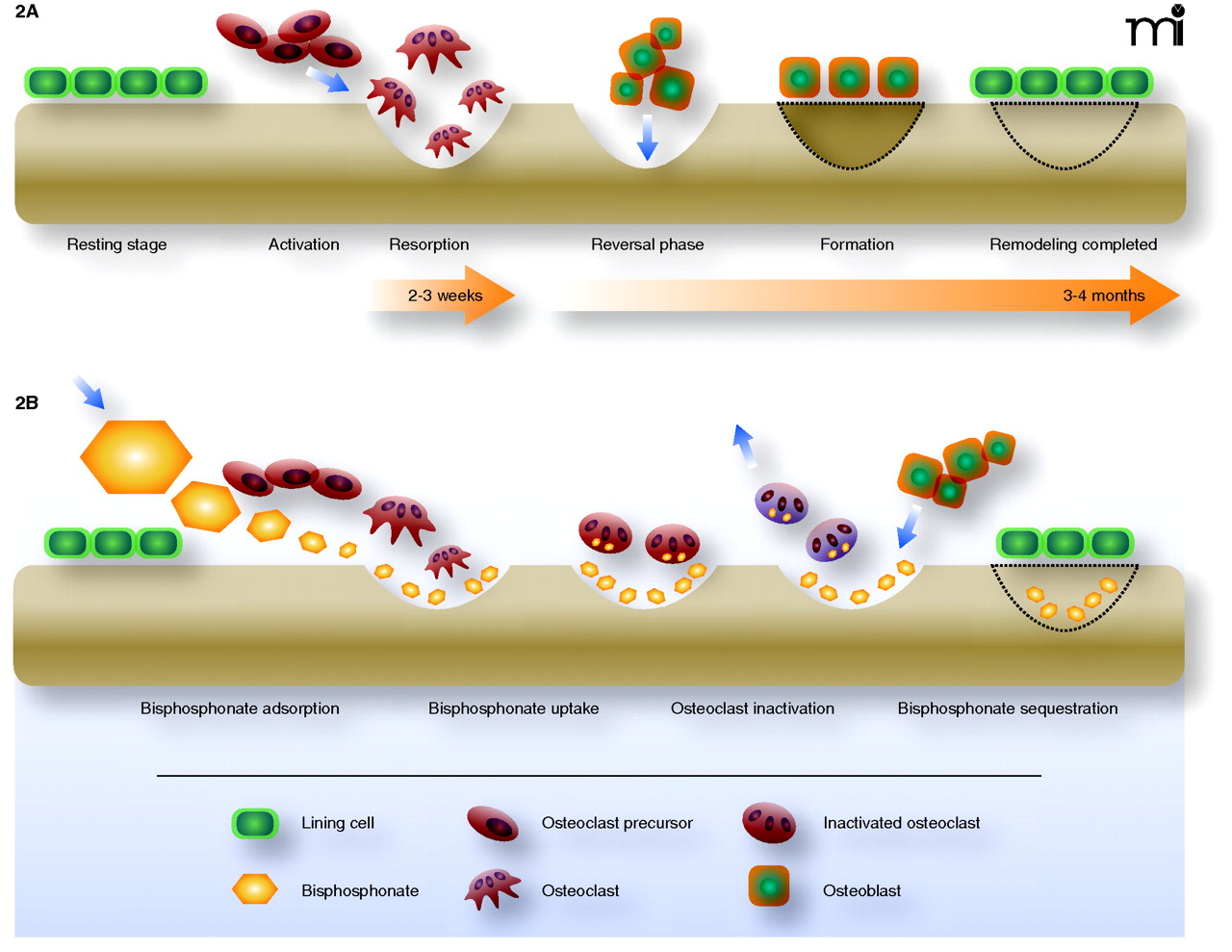 The dynamics of bone remodeling and mechanisms of bisphosphonate intervention. A) In the normal process of bone remodeling, the breakdown of bone matrix (resorption) is tightly coupled, both spatially and temporally, with regeneration of matrix (formation) in a highly dynamic process. The activation of osteoclast precursor cells results in the ruffled-border multinucleate morphology (i.e., the active osteoclast) that penetrates the bone lining and comes into contact with bone. Resorption is schematized here as a scalloped erosion (wells). Osteoblasts deposit bone matrix, which undergoes subsequent mineralization, and thereby function in concert with osteoclasts to maintain a healthy, dynamic skeleton. B) Bisphosphonates (shown as orange hexagons) intervene in the resorption process (as indicated by the relatively shallow wells) and can function to counteract disease processes such as osteoporosis. As pyrophosphate analogs, bisphosphonates associate tightly with hydroxyapatite exposed during osteoclast-mediated bone resorption. Bisphosphonates are taken up by osteoclasts and function as inhibitors of FPP synthase and promote osteoclast apoptosis. Bisphosphonates that bind to hydroxyapatite can also become embedded in the bone matrix by osteoblast function and bone mineralization (indicated here as “sequestration”). Embedded bisphosphonates can then be released by the normal bone cycle activities, depending on the prevalent rates of bone resorption and remodeling, and function in subsequent rounds of osteoclast inactivation. (Purple arrows indicate movement of cells or molecules relative to the bone surface.)