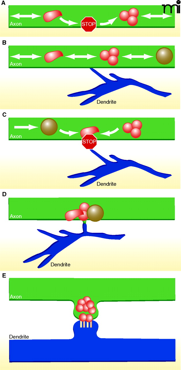 A model of synapse assembly. A. Before and during synapse formation, groups of synaptic vesicle and active zone proteins are transported along axons in precursor organelles, referred to as STVs (red) and PTVs (grey filled), respectively. STVs pause frequently at future sites of synapse formation. B. Axons and dendrites interact with one another. C. When axo-dendritic interactions occur at STV pause sites and trans-synaptic adhesion is engaged, contacts are stabilized. D. Synaptic proteins are deposited at the site of contact. E. Synaptic structures form, and synaptic proteins are sorted to their appropriate locations as the contact site differentiates into a functional synapse.