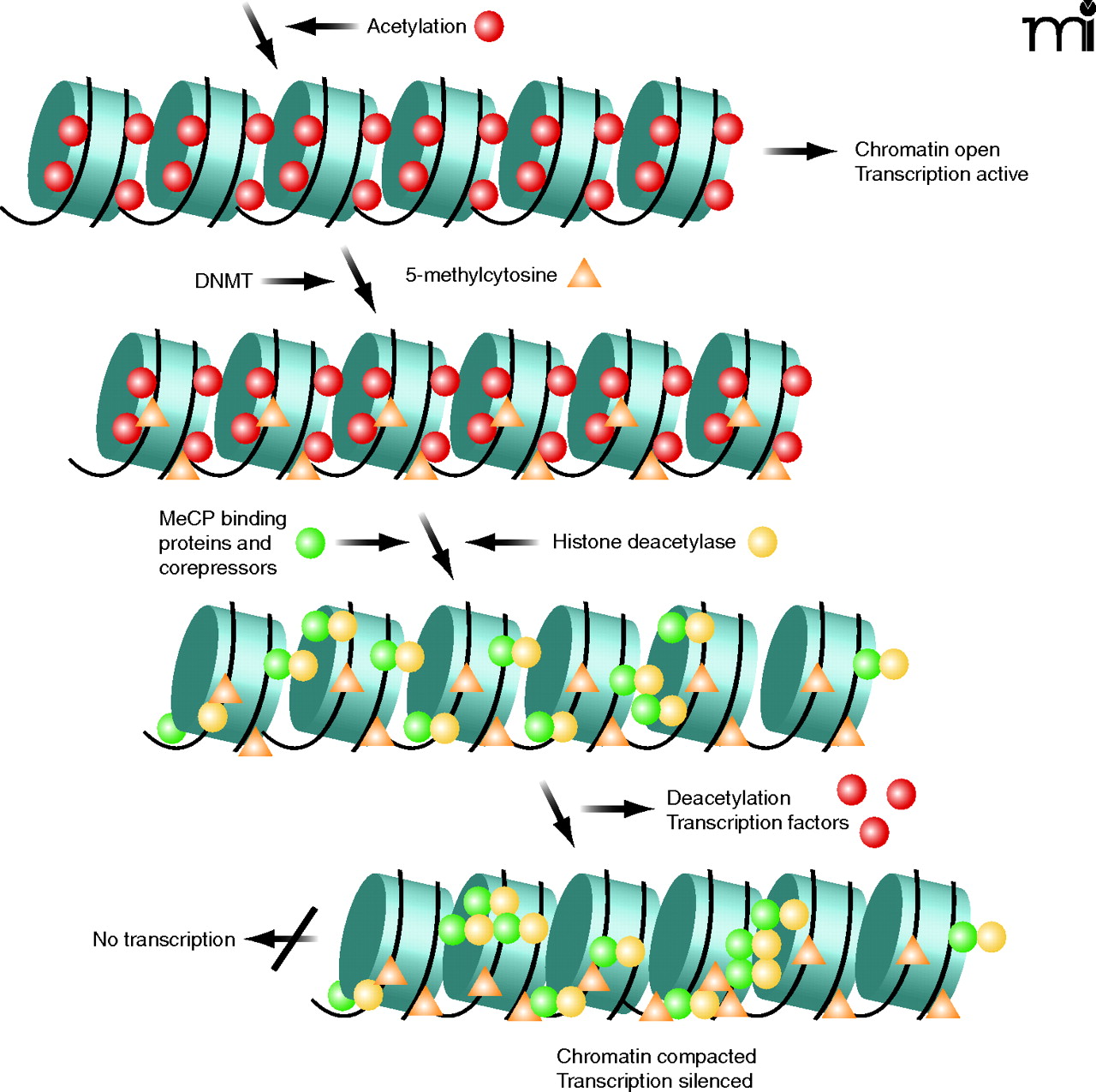 Gene silencing involves the cooperation of DNA (cytosine) methylation and histone acetylation. See text for details. Figure based on (32, 33).