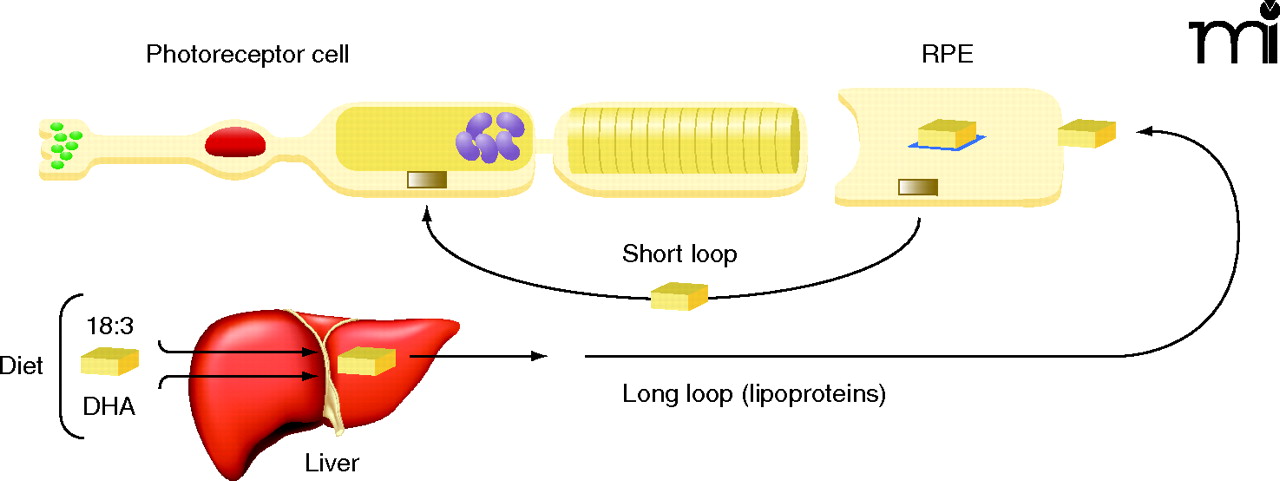 Highly efficient mechanisms for DHA utilization and recycling exist among RPE photoreceptor cells (short loop). These mechanisms complement the more significant uptake of dietary DHA from plasma lipoproteins (long loop). [Adapted with permission from (38).]