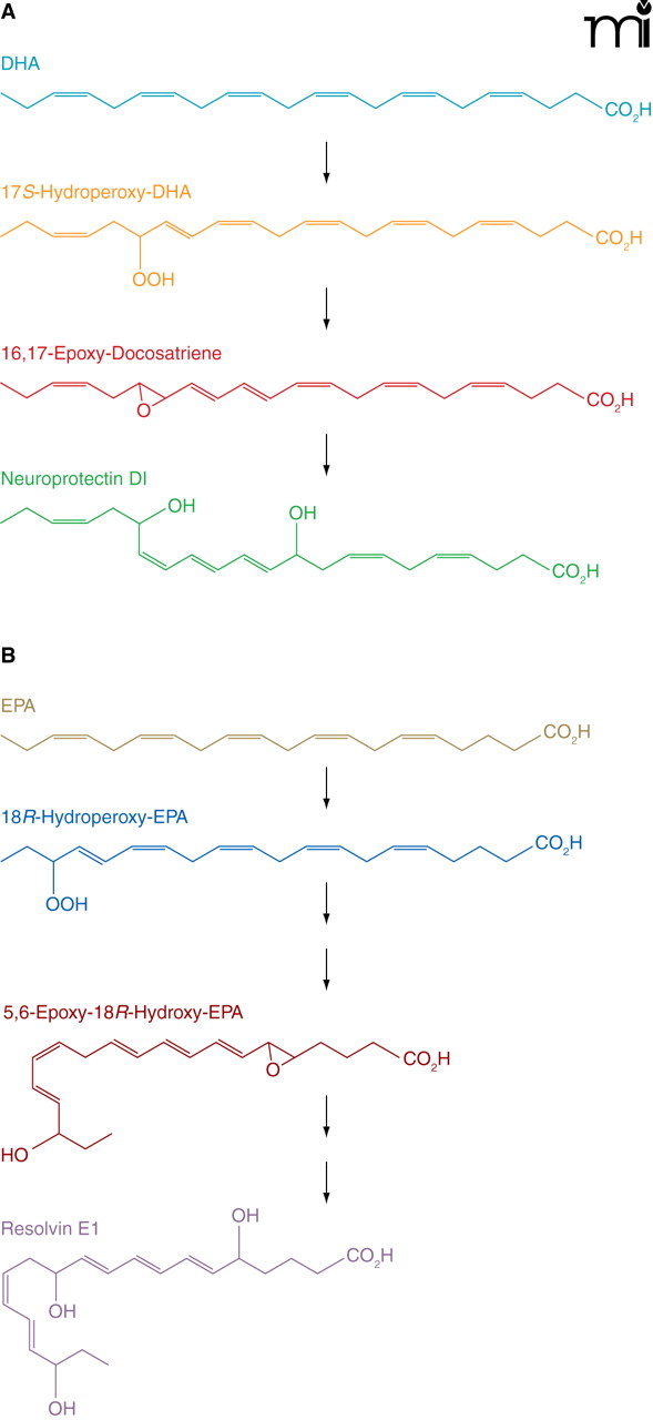 ω-Hydroxylation catalyzed by CYP4V2 may act at one or more levels of either pathway to modulate protectin/resolvin signaling. (See text for details.)
