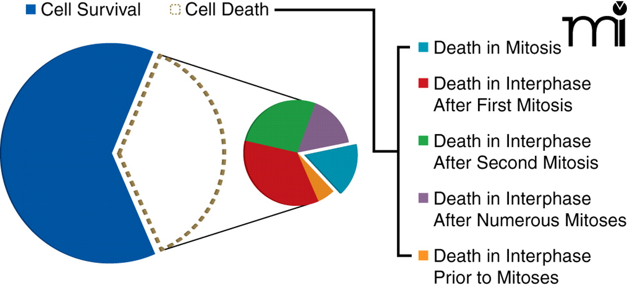 Population level analyses reveal the percentage of HeLa cells that survive (blue) or apoptose (white) following treatment with nocodazole. Analysis of individual cells reveals the large amount of variation in how the cells die (smaller pie). Only a small minority of HeLa cells treated with nocodazole die during the first mitotic arrest, which is the presumed mode by which spindle toxins bring about cell death. Cells that survive represent both survival in interphase after mitosis (8%) and survival after replicating their genomes but failing to complete mitosis, i.e. endocycling (55%).