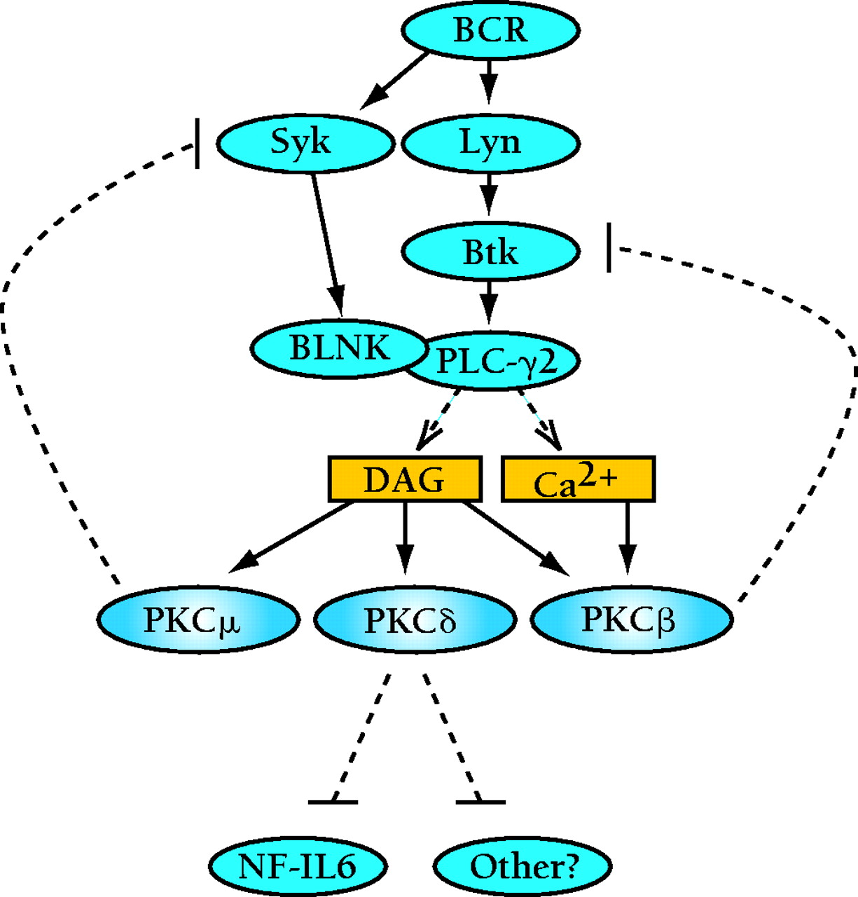 Negative roles for PKC isoforms in B lymphocyte signaling. B cell receptor (BCR) engagement leads to a cascade of signaling events, eventually leading to the activation of the B cell. Specific PKC isoforms that are activated by the BCR can inhibit B cell signaling. Although PKCβ and PKCμ function in negative feedback loops to inhibit the upstream activators Btk (itself activated bt the tyrosine kinase Lyn) and Syk, respectively, PKCδ may function to inhibit the NF-IL6 transcription factor. BLNK, B cell linker protein; Syk, a 72-kDa protein tyrosine kinase highly expressed in B cells; Btk, Bruton’s tyrosine kinase; DAG, diacylglycerol; NF-IL6, nuclear factor for interleukin-6 expression.