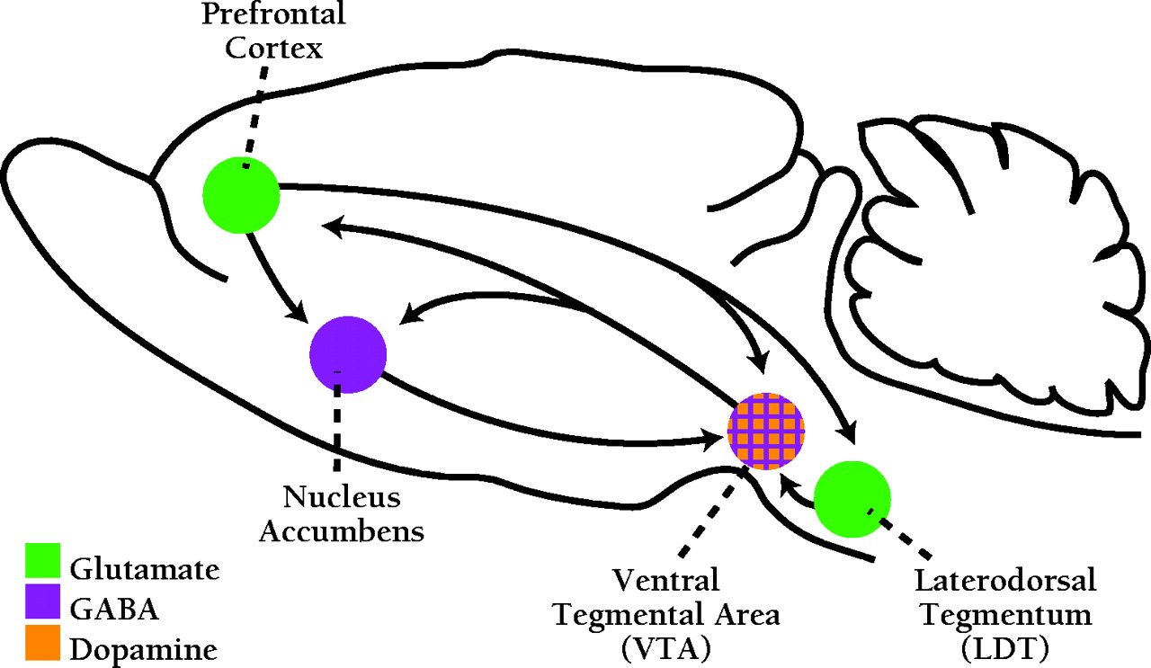 Addiction-related pathways in the rat brain. The VTA contains both dopamine and GABA neurons that innervate the nucleus accumbens, prefrontal cortex, and other forebrain targets not shown in the diagram. The prefrontal cortex sends glutamate projections to VTA, LDT, nucleus accumbens, and other limbic regions not shown in the diagram (see Figure 1). In the VTA, glutamate inputs from prefrontal cortex synapse on mesoaccumbens GABA neurons and mesoprefrontal DA neurons. Mesoaccumbens dopamine neurons also receive glutamate and cholinergic inputs from the LDT (cholinergic inputs not shown). See legend to Figure 3 for more details.