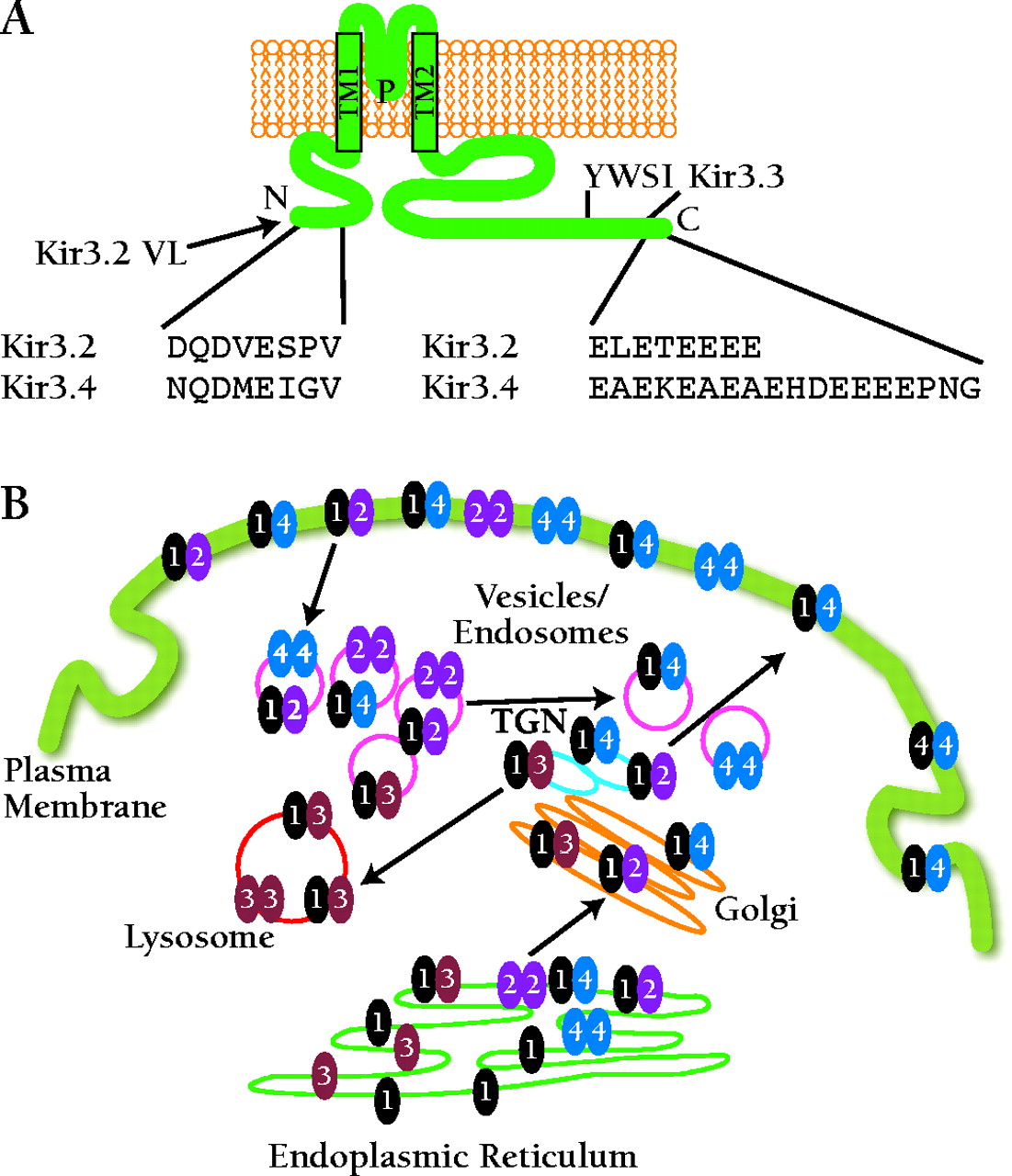 Kir3/GIRK channel trafficking. A. Diagram showing the topology of Kir channels and the location of the domains identified by Ma et al. (15) that play important roles in Kir3 channel trafficking. B. Schematic representation of the localization of different channel subunits (Kir3.1—Kir3.4). Channels and cell compartments are color coded. Combinations of only two subunits (rather than four) are shown for purposes of illustration. Kir, inwardly rectifying K+ channels; GIRK, G protein-regulated inwardly rectifying channels; TM, transmembrane; P, P-region; TGN, trans Golgi network.