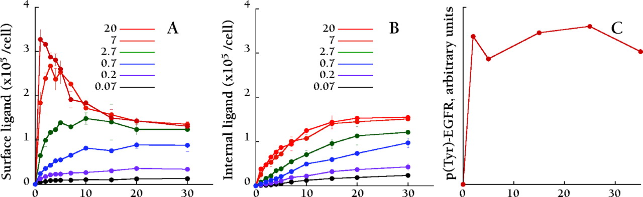 Compartmentalization of active EGFRs. Time courses of surface-bound (A) and internal (B) EGF in NR6 fibroblasts expressing the human EGFR (J.M.H., unpublished). At time zero, cells were stimulated with a constant concentration of EGF (0.07, 0.2, 0.7, 2, 7, or 20 nM, from lowest to highest receptor binding), and surface-bound ligand was dissociated in pH 3 buffer at the indicated time points. C. Time course of EGFR autophosphorylation, 20 nM EGF stimulation, adapted from (27). Receptor activation changes very little in the first 30 minutes of maximal EGF stimulation, whereas after 24 hours these cells exhibit significant receptor downregulation (14).
