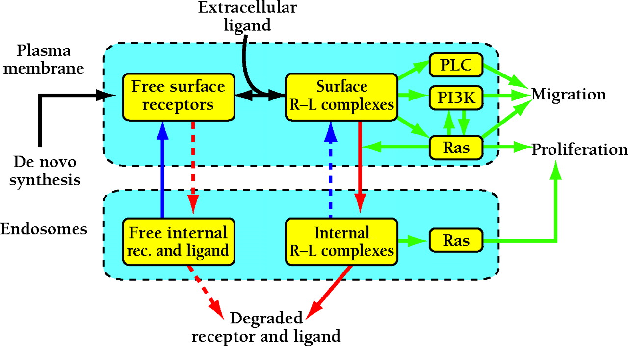 Integrated model of RTK regulation and signaling. Signal transduction hinges on the number of active receptors and their compartmentalization over time. Both are subject to receptor trafficking processes. Dashed arrows signify processes that occur at slower rates per receptor in normal cells; however, these processes become increasingly significant as the number of receptors increases, with saturation of the internalization and endosomal retention mechanisms. In addition to regulating the total number of receptors, trafficking processes may bias the specificity of receptor signaling. Surface receptors activate the PLC, PI3K, and Ras–Erk pathways, stimulating both cell migration and proliferation. The Ras–Erk and PI3K pathways engage in crosstalk interactions in both directions, and some of these may only manifest themselves at the plasma membrane, reinforcing cell motility signaling. Internalized receptors can activate the Ras–Erk pathway to extend the duration of cell proliferation signals. Interestingly, activated Ras can enhance receptor internalization through the GTPase Rab5 [reviewed in (22)], providing a negative feedback loop mediating receptor downregulation and a regulatory mechanism governing the balance of cell migration and proliferation signaling.