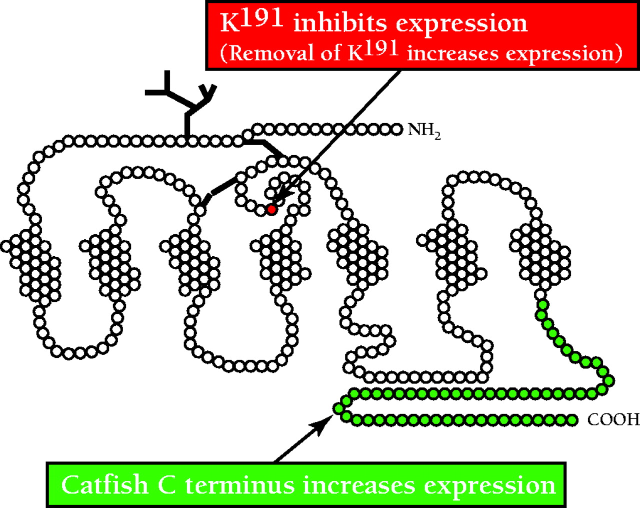 Two modifications of the GnRHR associated with altered expression. Addition of K191, an “extra” amino acid that appears in humans and other primates is associated with diminished receptor expression at the plasma, membrane. Pre-mammalian animals (fish, birds) have a C-terminal tail extension, absent in mammals, that enhances expression of the receptor. Accordingly, the tendency is to evolve a receptor that can be more closely regulated due to diminished expression.