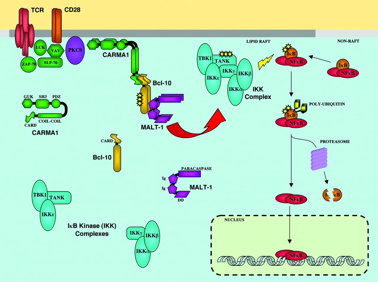 The coligation of the TCR with CD28 results in the activation of tyrosine kinases and the recruitment of lipid rafts to the aggregated TCR. Several receptor proximal tyrosine kinases, adaptors, and effectors, including Lck, ZAP-70, SLP-76, and Vav, have been implicated in the regulation of NF-κB and the recruitment of PKC?? to lipid rafts. CARMA1, specifically required for the activation of NF-κB by the TCR and PKC??<links raft-associated receptor complexes to Bcl-10 through the heterodimerization of the CARMA1 and Bcl-10 CARD domains. CARMA1 membrane association is most likely driven by the MAGUK homology region, which consists of a PDZ domain, a SH3 domain, and a guanylate kinase (GUK) homology domain. The recruitment of Bcl-10 results in its phosphorylation, with unknown consequences. Bcl-10 directs the multimerization of the human paracaspase MALT1, which interacts with Bcl-10 through its immunoglobulin-like (Ig) domains. Multimerization of the MALT1 paracaspase domain is sufficient to activate NF-κB by unknown mechanisms. Ultimately, NF-κB activation is triggered by the induced phosphorylation, ubiquitinylation, and proteasomal degradation of IκB. The canonical IκB kinase (IKK) complex—consisting of the kinases IKKα and IKKβ, and the linker IKKγ—is required for the initiation of this degradative process. Preliminary evidence suggests that additional IκB kinases (TBK1, IKKε) and scaffolds (TANK) participate in the degradation of IκB in response to TCR ligation or phorbol ester and calcium ionophore treatment. TCR, T cell receptor; ZAP-70, TCRζ-associated protein of 70-kD; IKK, inhibitor-of-κB kinase; SLP-76, SH2 domain-containing leukocyte protein of 76-kD; CARMA1, caspase recruitment domain-containing MAGUK protein-1; MALT1; mucosa-associated lymphoid tissue of B lymphoma 1; nuclear factor-κB, NF-κB; TANK, tumor necrosis factor receptor-associated factor (TRAF) family member-associated NF-κB activator; TBK1, TANK-binding kinase 1.